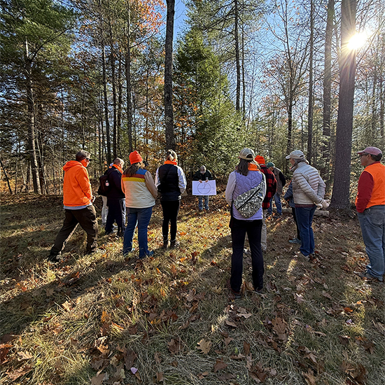 Participants enjoyed an easy walk through thriving forest and wetlands while hearing first-hand how thoughtful forest management supports wildlife habitat, addresses invasive species, and maintains the health and resilience of the land. One of the most memorable stops was the beaver pond, now flourishing due to Ned’s thoughtful stewardship of the surrounding forest. Attendees enjoyed a postcard-worthy moment as brilliant fall colors mirrored across the pond’s glassy surface.